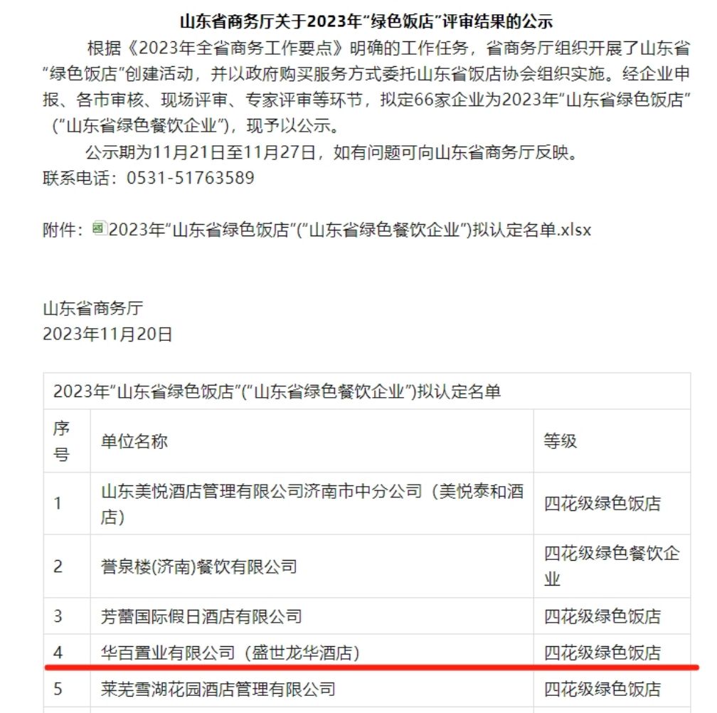 近日,山東省商務(wù)廳批準(zhǔn)華百置業(yè)盛世龍華酒店山東省四花級綠色飯店稱號,這是濟(jì)陽區(qū)首個申報并評審?fù)ㄟ^的省級綠色飯店,全省僅14家飯店獲此榮譽(yù)。