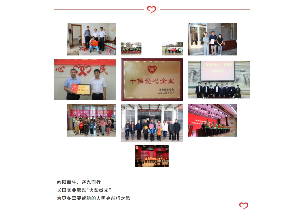 愛是善良之火,點亮希望的火炬;愛是治愈之光,驅(qū)散所有的黑暗。長田實業(yè)致力于以“火柴微光”,為需要幫助的人照亮前行之路。2020年,長田實業(yè)注資500萬元成立濟陽區(qū)首支“善美濟陽人”基金,弘揚善美精神,傳遞善美力量;2021年,向濟南市殘疾人福利基金會捐贈50萬元,向眼科醫(yī)院捐贈50萬元,在“愛心企業(yè)集中捐贈儀式”中,捐贈10萬元;2023年底,甘肅臨夏州積石山縣6.2級地震牽動人心,長田實業(yè)積極響應(yīng)區(qū)婦聯(lián)號召,向積石山縣捐贈價值3萬元的抗震救災(zāi)愛心物資;2024年4月,在濟南市紅十字應(yīng)急救援隊成立12周年活動中,捐贈3萬元,以高度的社會責(zé)任感傳遞長田慈善力量。