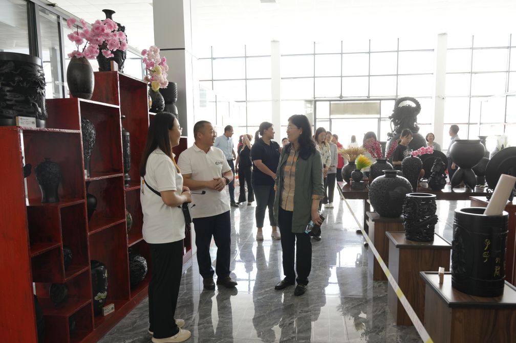 在基地,遲主席一行首先參觀了易豐居民宿,領(lǐng)略了別樣的融合了現(xiàn)代與古典元素的北方民宿風(fēng)格。接著,她們走進(jìn)了濟(jì)水春秋博物館,感受了濟(jì)水流域悠久的歷史文化和人文底蘊(yùn)。在龍格黑陶展示區(qū),遲主席被精美的黑陶作品深深吸引,對龍格黑陶的制作工藝和傳承價(jià)值表示贊賞。