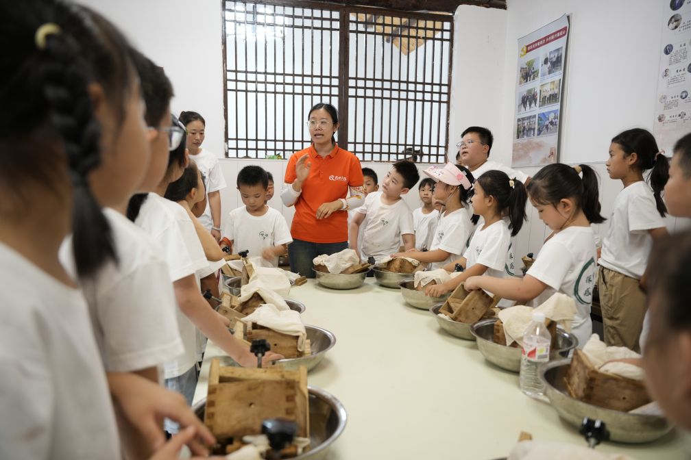 隨后,研學老師將豆花一一分至孩子們手中,放入木質模具中用重物壓實,隨著水分流出,一塊豆腐便制作完成了。在制作過程中,不僅見證了"黃豆"到"豆腐"的奇妙變化,還能體驗傳統(tǒng)手藝的魅力,領略中國飲食文化的博大精深。