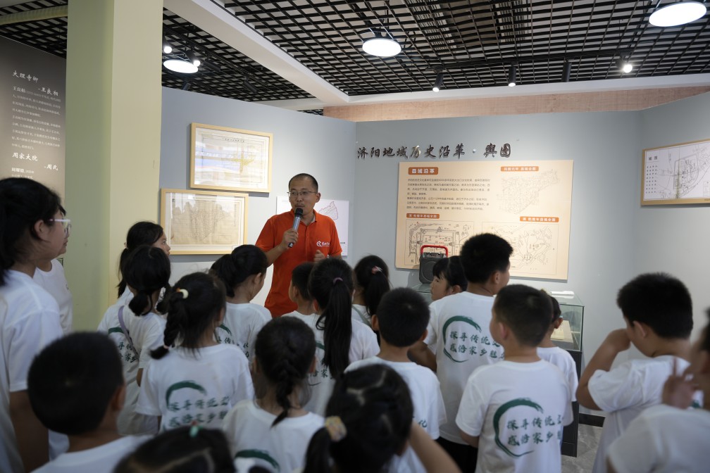 與文物對話,駐足歷史痕跡,感受文化的無窮魅力,增強孩子們的文化自信。孩子們在講解員的引領下參觀基地內濟水春秋博物館,館內陳列著大量的珍貴古籍文獻,涵蓋古代歷法、古代文學、古代農業(yè)等各個門類,各類歷史文獻描繪了濟陽厚重的歷史進程,孩子們在參觀中學習家鄉(xiāng)的歷史文化,了解濟陽故事,增強對家鄉(xiāng)的了解,提升文化自信。