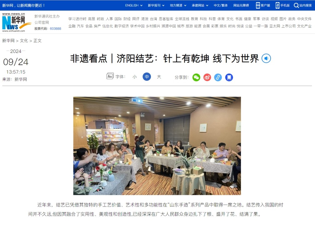 2024年9月24日,新華網(wǎng)對(duì)濟(jì)北手造:濟(jì)陽結(jié)藝進(jìn)行了點(diǎn)贊報(bào)道,稱之為“針上有乾坤 線下為世界”。2023年5月,由山東濟(jì)北手造文化發(fā)展有限公司擔(dān)任項(xiàng)目保護(hù)單位,將“濟(jì)陽結(jié)藝”進(jìn)行了組織上報(bào),并順利通過公示,成為濟(jì)南市濟(jì)陽區(qū)第七批非物質(zhì)文化遺產(chǎn)代表性項(xiàng)目。近年來,結(jié)藝已憑借其獨(dú)特的手工藝價(jià)值、?藝術(shù)性和多功能性在“山東手造”系列產(chǎn)品中取得一席之地。結(jié)藝傳入我國的時(shí)間并不久遠(yuǎn),但因其融合了實(shí)用性、美觀性和創(chuàng)造性,已經(jīng)深深在廣大人民群眾身邊扎下了根、盛開了花、結(jié)滿了果。