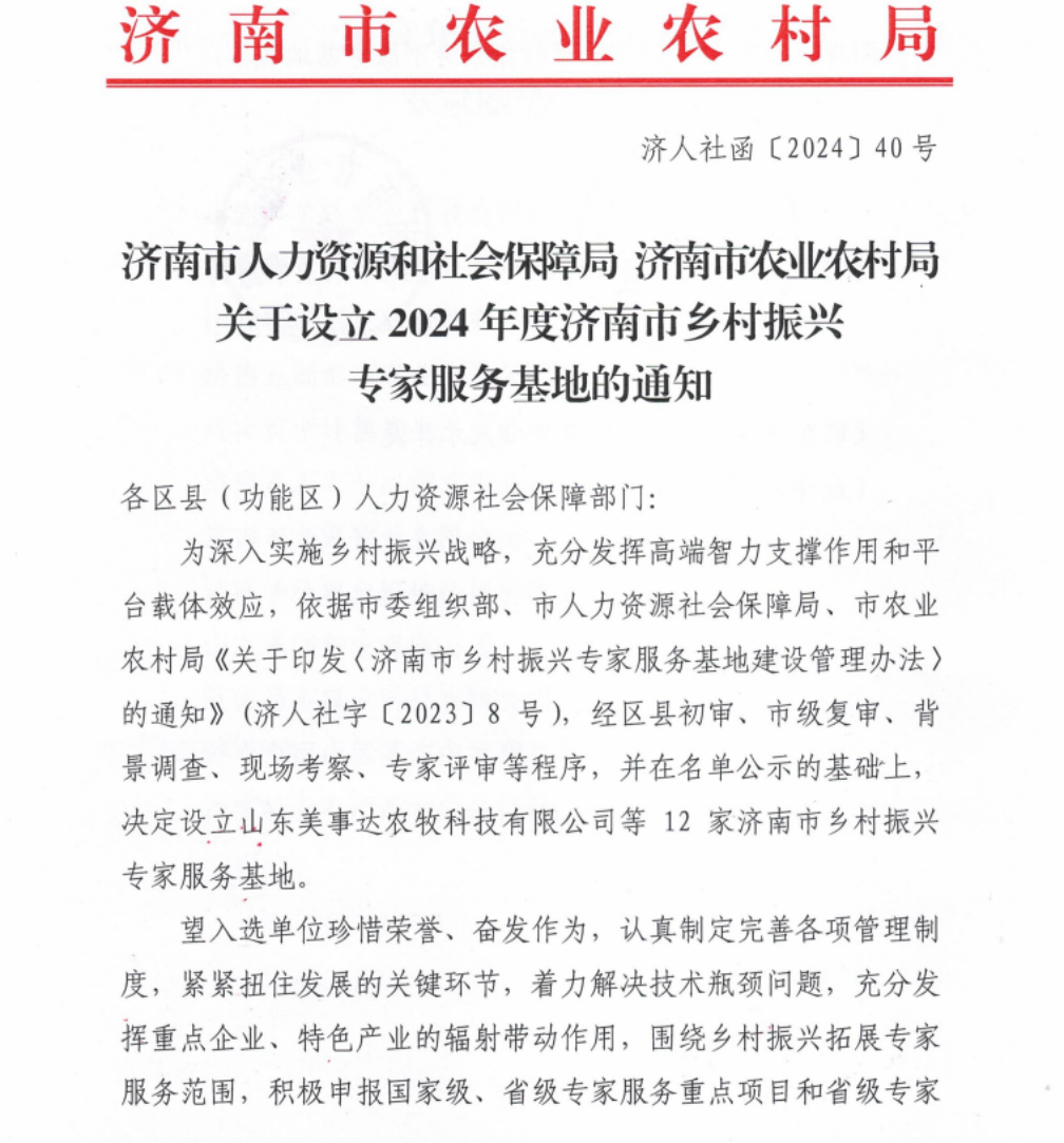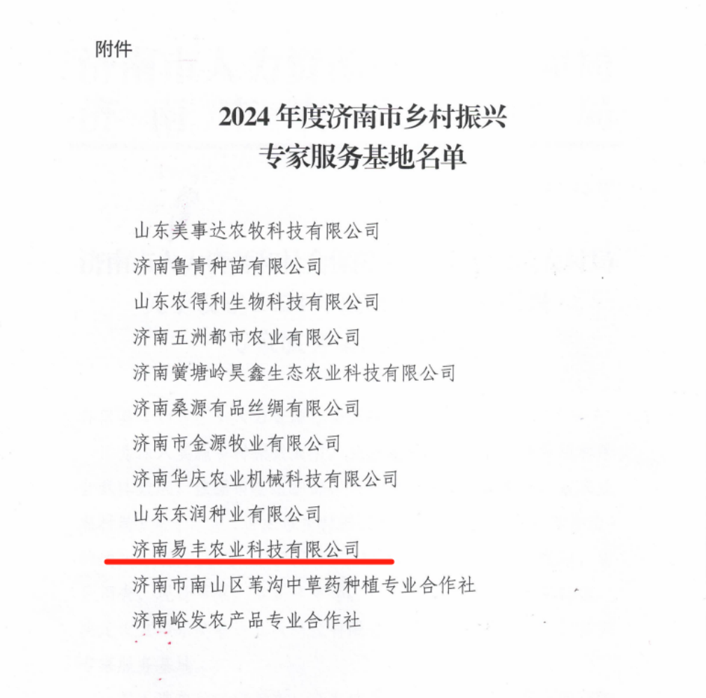 12月31日,中共濟(jì)南市委組織部、濟(jì)南市人力資源和社會保障局、濟(jì)南市農(nóng)業(yè)農(nóng)村局下發(fā)《關(guān)于設(shè)立2024 年度濟(jì)南市鄉(xiāng)村振興專家服務(wù)基地的通知》,經(jīng)過嚴(yán)格評審與層層篩選,濟(jì)南易豐農(nóng)業(yè)科技有限公司成功入選“2024年市級專家服務(wù)基地”,為專家服務(wù)鄉(xiāng)村振興提供平臺!
