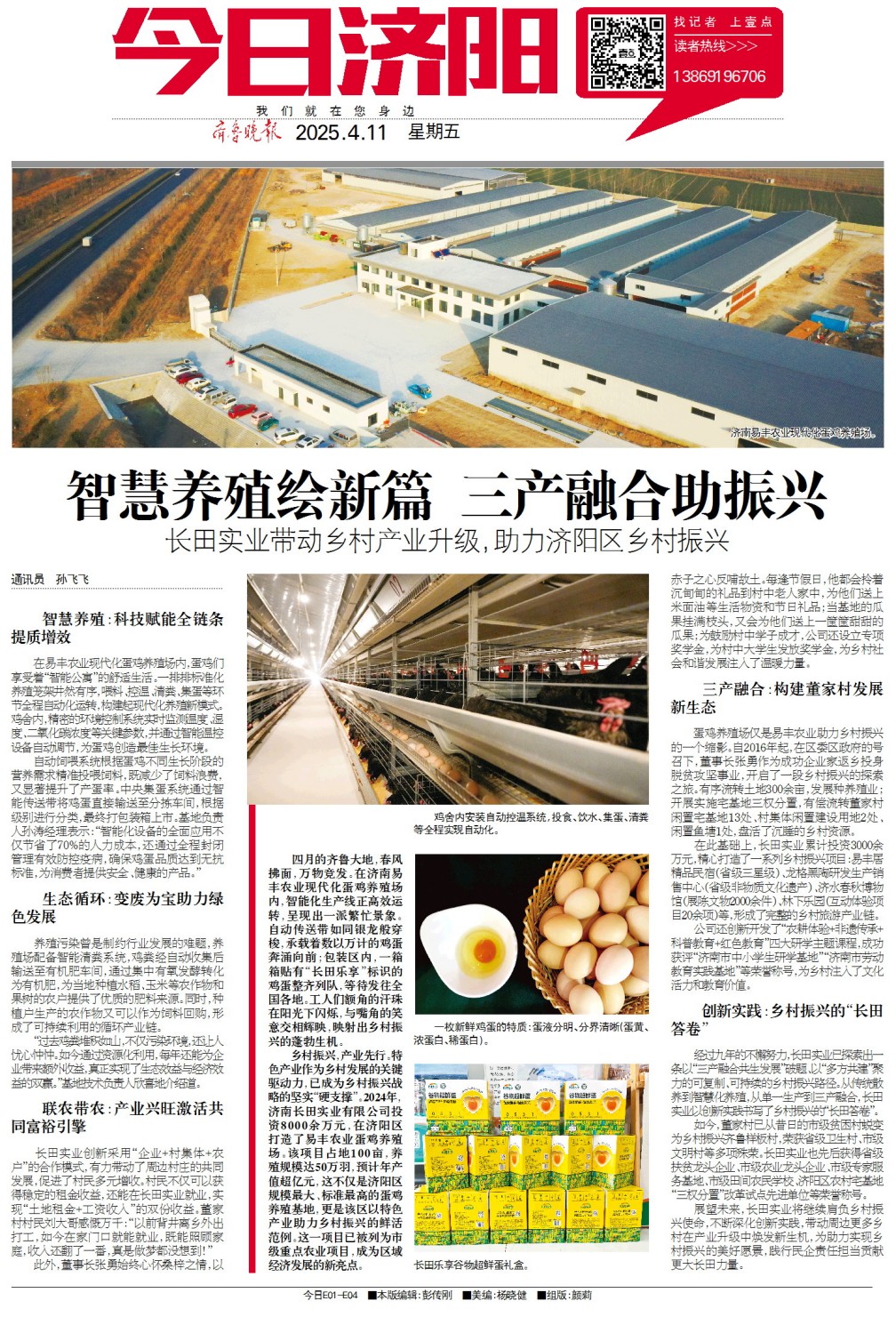 2024年,四月的齊魯大地,春風拂面,萬物競發(fā)。在濟南易豐農(nóng)業(yè)現(xiàn)代化蛋雞養(yǎng)殖場內(nèi),智能化生產(chǎn)線正高效運轉(zhuǎn),呈現(xiàn)出一派繁忙景象。自動傳送帶如同銀龍般穿梭,承載著數(shù)以萬計的雞蛋奔涌向前;包裝區(qū)內(nèi),一箱箱貼有“長田樂享”標識的雞蛋整齊列隊,等待發(fā)往全國各地。工人們額角的汗珠在陽光下閃爍,與嘴角的笑意交相輝映,映射出鄉(xiāng)村振興的蓬勃生機。