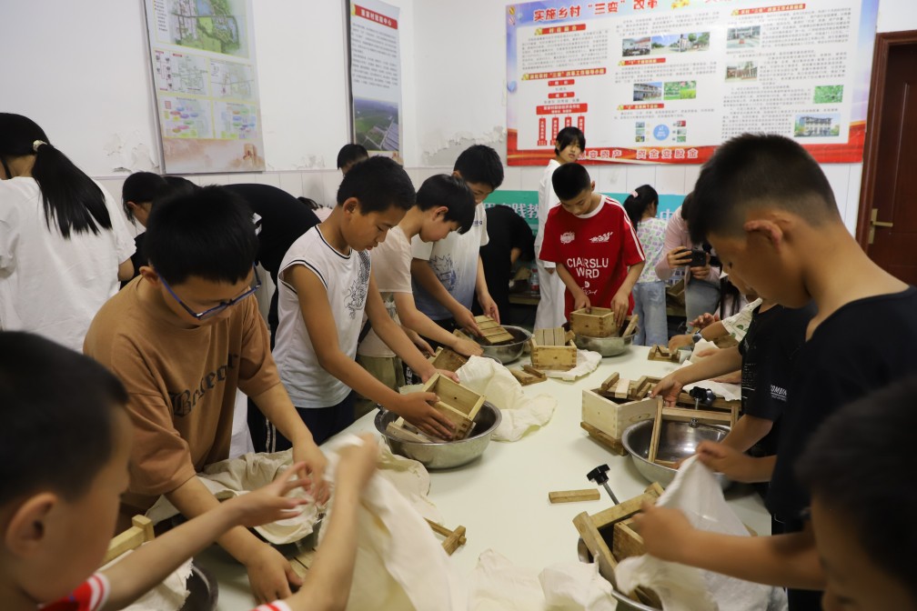 在豆工坊追溯百年匠心傳承,體驗非遺石磨工藝。孩子們推動磨把,乳白的豆?jié){緩緩滲出,空氣中漸漸彌漫出清新的豆香。孩子們小心翼翼地將豆花倒入模具,輕輕壓實。等待脫模時,每個孩子都充滿期待。當孩子們打開模具,看著自己親手制作的豆腐,臉上洋溢著自豪的笑容。