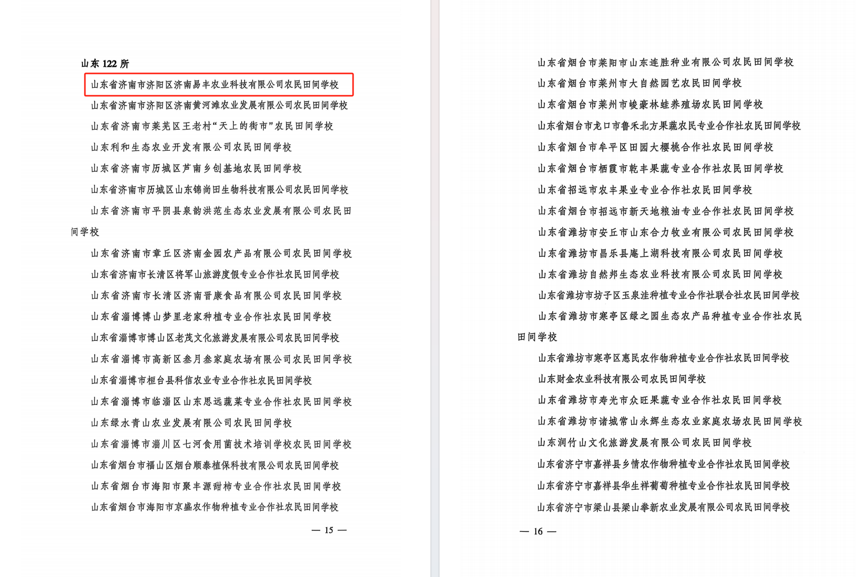 2025年6月9日,中央農(nóng)業(yè)廣播電視學(xué)校(農(nóng)業(yè)農(nóng)村部農(nóng)民科技教育培訓(xùn)中心)公布了“第二批全國(guó)縣級(jí)優(yōu)質(zhì)農(nóng)民田間學(xué)校名單”。濟(jì)南易豐農(nóng)業(yè)科技有限公司農(nóng)民田間學(xué)校,榮耀上榜,榮獲國(guó)家級(jí)殊榮!
