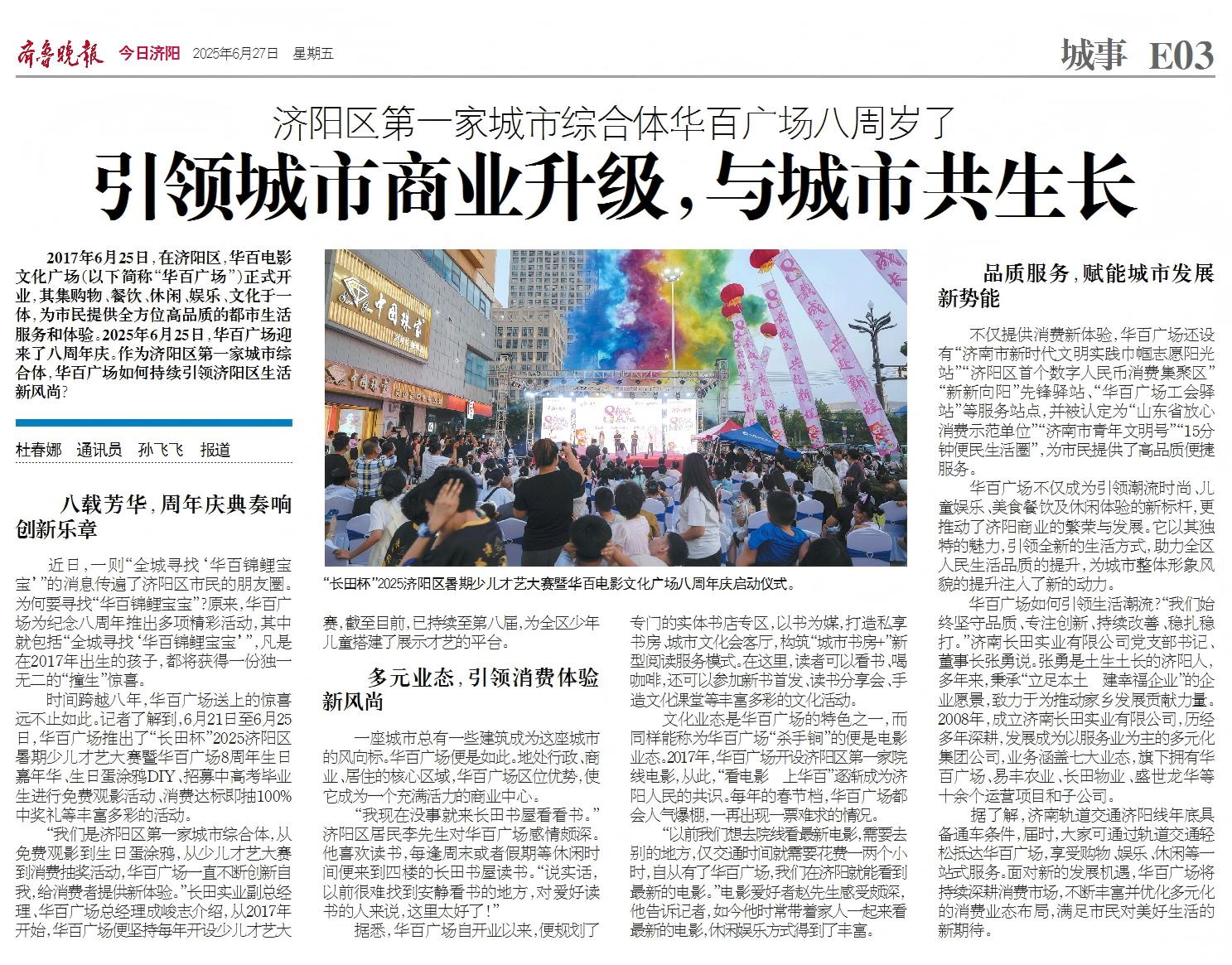 2017年6月25日,在濟(jì)陽區(qū),華百電影文化廣場(以下簡稱“華百廣場”)正式開業(yè),其集購物、餐飲、休閑、娛樂、文化于一體,為市民提供全方位高品質(zhì)的都市生活服務(wù)和體驗。2025年6月25日,華百廣場迎來了八周年慶。作為濟(jì)陽區(qū)第一家城市綜合體,華百廣場如何持續(xù)引領(lǐng)濟(jì)陽區(qū)生活新風(fēng)尚?